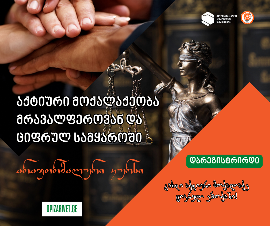 სსიპ კოლეჯი „ოპიზარი“ აცხადებს მიღებას არაფორმალურ საგანმანათლებლო კურსზე „აქტიური მოქალაქეობა მრავალფეროვან და ციფრულ სამყაროში“. კურსის ფარგლებში მონაწილეები: გააცნობიერებენ მრავალფეროვანი საზოგადოების მნიშვნელობას და თანაცხოვრების პრინციპებს; ისწავლიან უფლებებისა და მოვალეობების ამოცნობას ყოველდღიურ ცხოვრებაში; განივითარებენ პასუხისმგებლობას როგორც ინდივიდუალურ, ისე საზოგადოებრივ დონეზე; დაეუფლებიან ციფრული […]